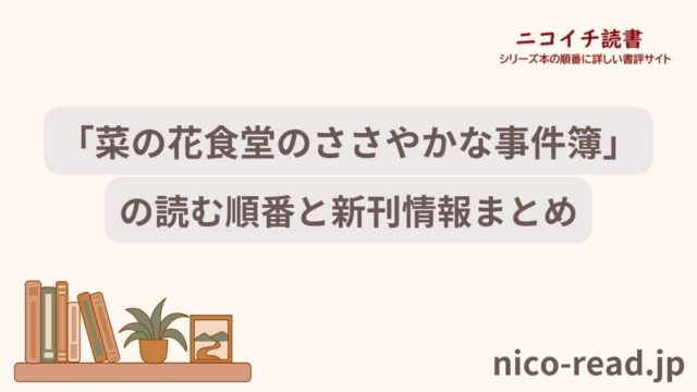 シリーズごと 「菜の花食堂のささやかな事件簿」シリーズの読む順番と新刊情報まとめ 2024年9月21日 たkる https://nico-read.jp/wp-content/uploads/2021/04/nicoichiread-2400-toukamae.png ニコイチ読書